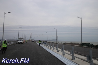 Он отметил, что автодорога на мосту заасфальтирована на 70%. Всего заасфальтировано 14 из 19 км. Параллельно укладке асфальта ведётся обустройство барьерного ограждения, которое уже выполнено на 60%. Смонтировано 70% элементов искусственного освещения.