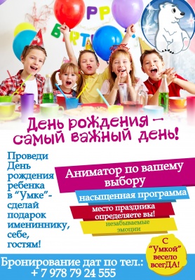 Близится торжество и обычное застолье с гостями хочется превратить в феерию впечатлений для ребенка? Профессиональный коллектив аниматоров «УМКИ» с радостью позаботится о том, чтобы день рождения и любой другой праздник стал знаменательной датой не только для семьи, но и для всех приглашенных гостей!