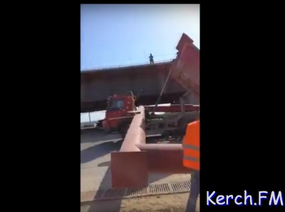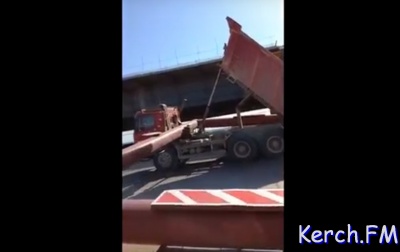 На Крымском мосту на самосвал упал металлический ограничитель габарита (видео)