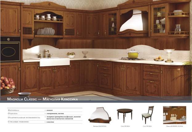 Модель Magnolia (Магнолия) - яркий представитель классического стиля. Фасады и декоративные элементы теплого янтарного цвета с рубиновым оттенком выполнены из массива акации, отличающейся твердой древесной и ярко выраженной древесной фактурой. Филенка декорирована лазерной гравировкой с изящным орнаментом. Особый шарм модели придает витраж в классическом итальянском стиле, сочетающий в себе воздушный узор необычного стекла в обрамлении профиля «состаренная латунь» с деколью, воспроизводящей натюрморт с фруктами. Столешница из искусственного акрилового камня/пластик. Корпус ЛДСП/столярная плита/ фанера/ МДФ, отделка шпон ценных пород дерева/пластик/эмаль/шпон. Механизмы трансформации Blum/Hettich/Hafele. Для модели разработаны декоративные стекла, вытяжка и столовая группа.