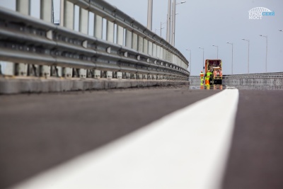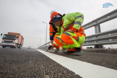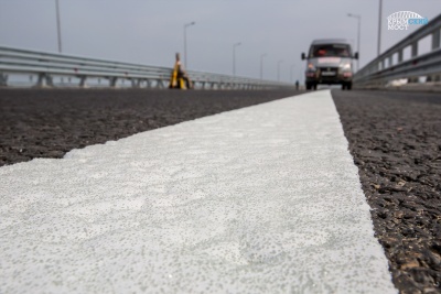 Разметка на Крымском мосту выполняется из материалов, обеспечивающих высокие стандарты безопасности и комфорта движения автомобилей в любое время суток.