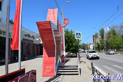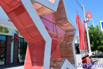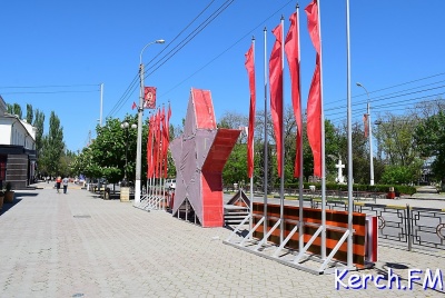 В Керчи 3 мая на улице Кирова установили трибуну со звездой. Рядом установили красные флаги и надписи «Победа», - передает Керчь.ФМ