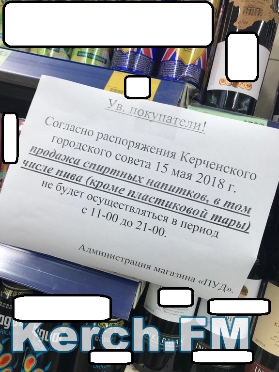 В Керчи 15 мая с 11.00 до 21.00 в супермаркетах города запретили продавать алкоголь. Распоряжения об этом вывесили в магазинах, - передает Керчь.ФМ