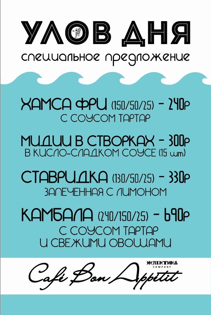 Улов дня - специальное предложение лета от шеф-повара кафе.