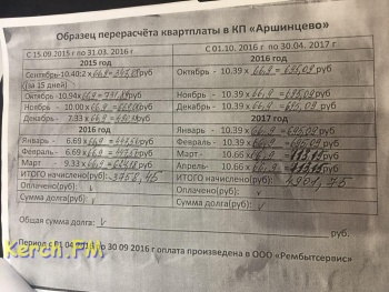 КП «Аршинцево» посчитало, что оно обслуживало нас целый август месяц и за, к примеру, двухкомнатную квартиру, насчитало 6203, 65 рублей. Это по тарифу 125, 58 за кв.м. А по факту КП «Аршинцево» нас обслуживало всего 7 дней (по спорам кто обслуживает Нижний Солнечный были суды в Симферополе, где было вынесено решение, что нас обслуживает и обслуживало в спорный период Рембытсервис). Если считать, что КП «Аршинцево нас обслуживало только 7 дней, то нам вообще посчитали по тарифу 886, 23 рубля за квадратный метр. А не дохрена ли?", - возмущаются жители дома.