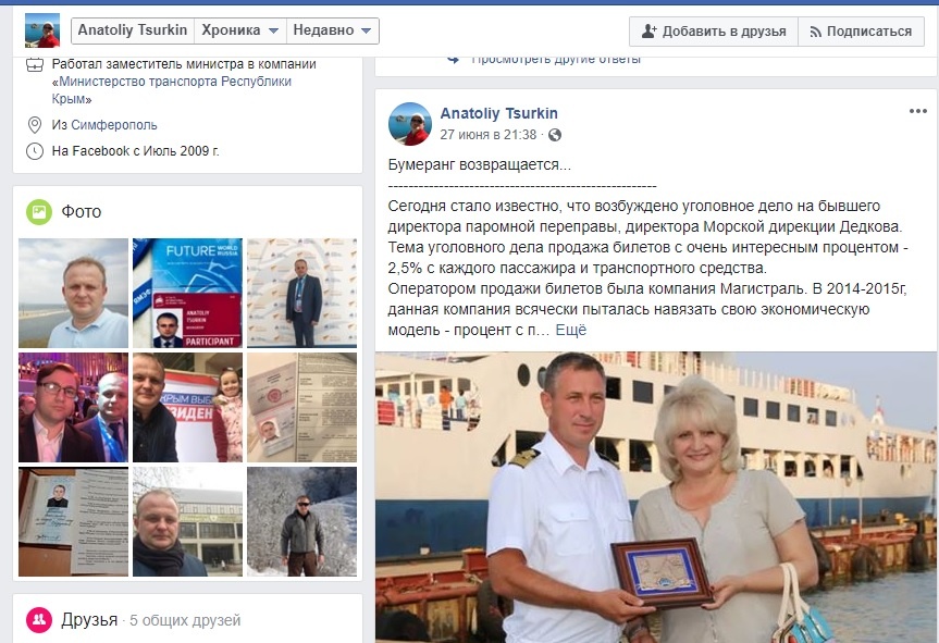 Возбуждено уголовное дело на бывшего директора паромной переправы, директора Морской дирекции Дедкова. Об этом в соцсетях сообщил бывший министр транспорта РК Анатолий Цуркин, - передает Керчь.ФМ