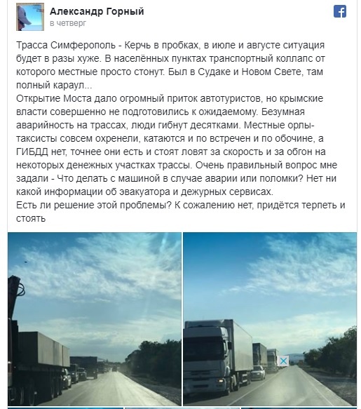 Горный опубликовал фотографии загруженных дорог в Фейсбуке и отметил, что «в июле и августе ситуация будет в разы хуже», сообщают Новости Крыма, - передает Керчь.ФМ.