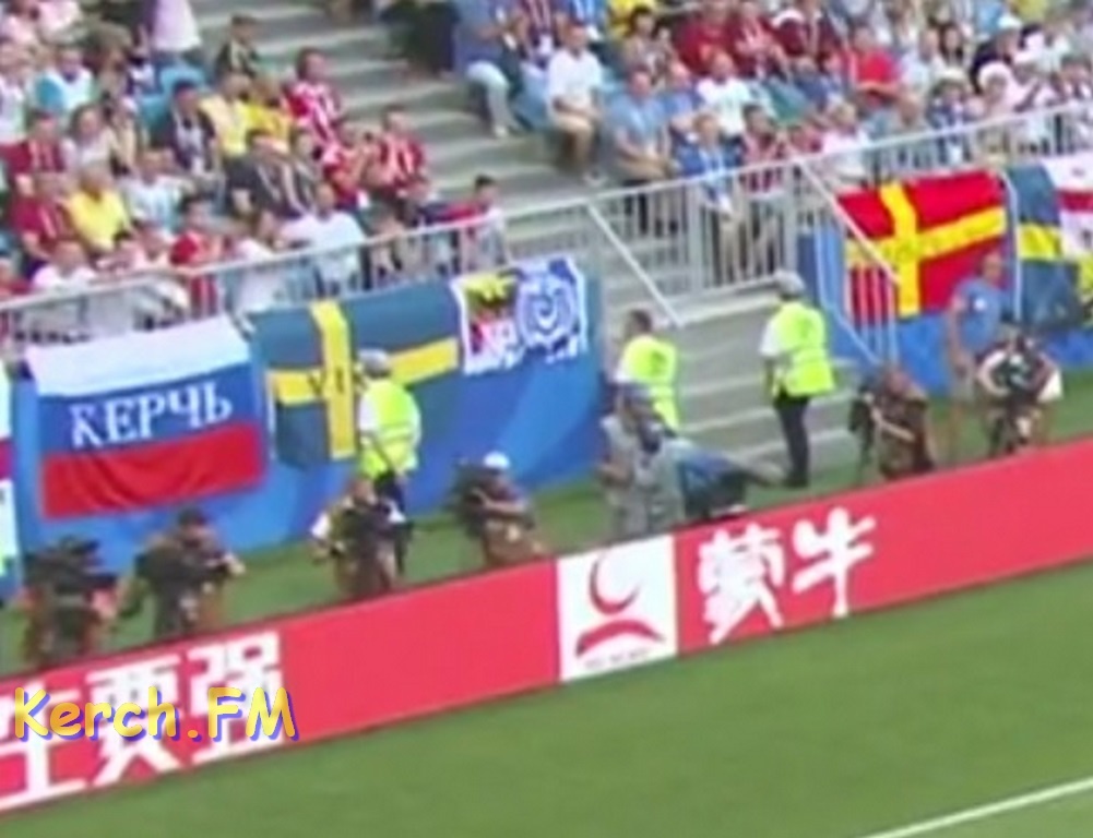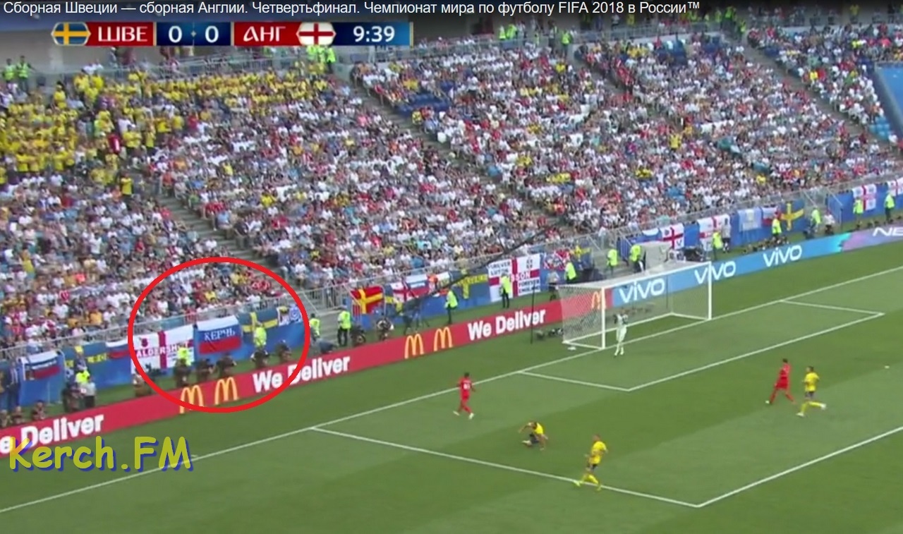 Российский флаг с надписью Керчь на синей полосе вывесили за воротами шведской команды на матче Англия-Швеция, - передает Керчь.ФМ.