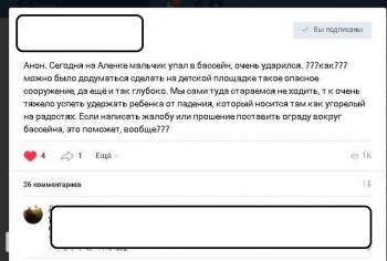 «В результате халатных действий Администрации города Керчь при реконструкции и открытии в 2017году сквера Аленки регулярно страдают дети, одни бьются об каменные бордюры каменного фонтана, а другие дети падают с высоты во внутрь глубоких каменных чаш.