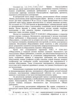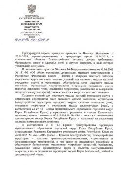 В прокуратуре керчанке ответили, что администрация не предприняла меры к надлежащему содержанию фонтана. Также отсутствует информационный стенд, на котором должны быть размещены правила и возрастные требования к пользованию оборудования. Снижает безопасность и деревянный домик, у которого отсутствует часть покрытия. Все это может привести к получению травм.