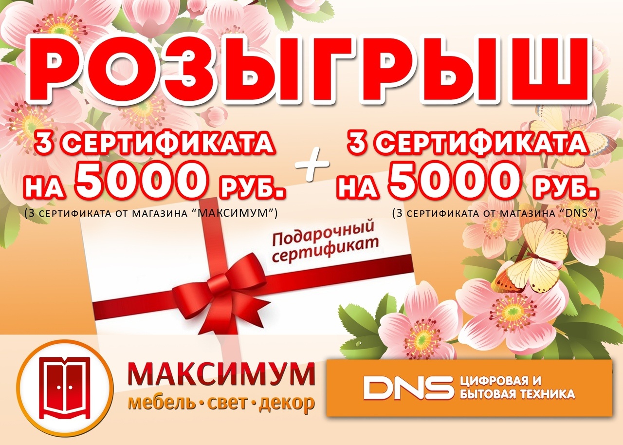 3 сертификата по 5000 рублей на покупки в магазине «Максимум»