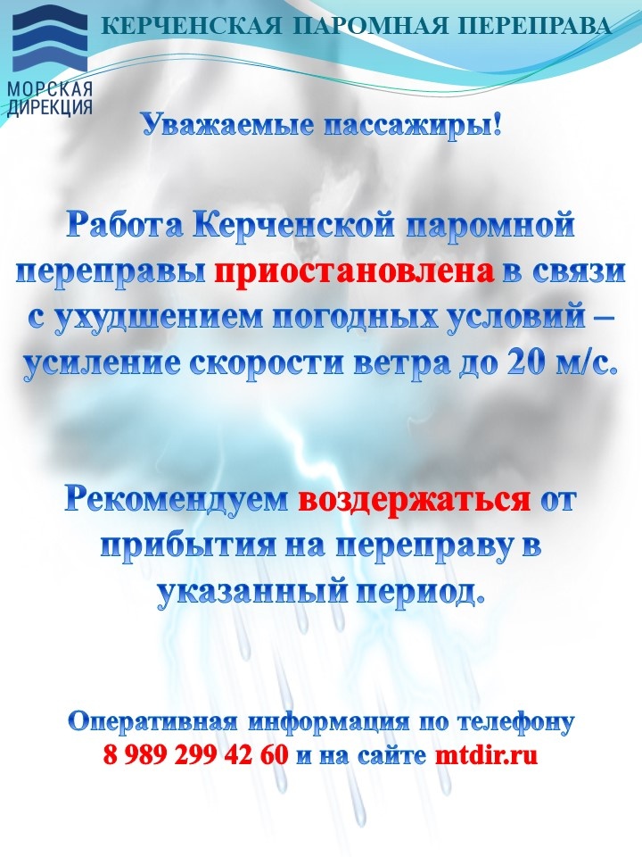 Керченская паромная переправа 9 августа приостановила свою работу в связи с погодными условиями. Об этом сообщает ООО «Морская дирекция», - передает Керчь.ФМ