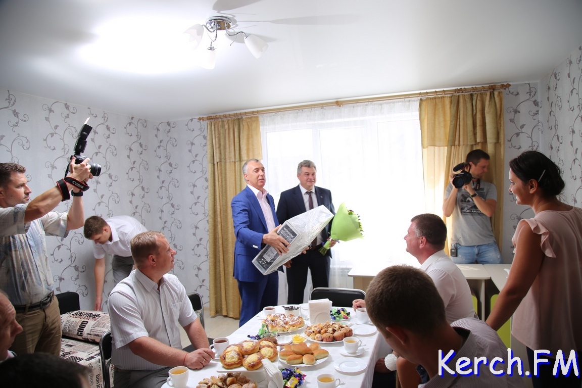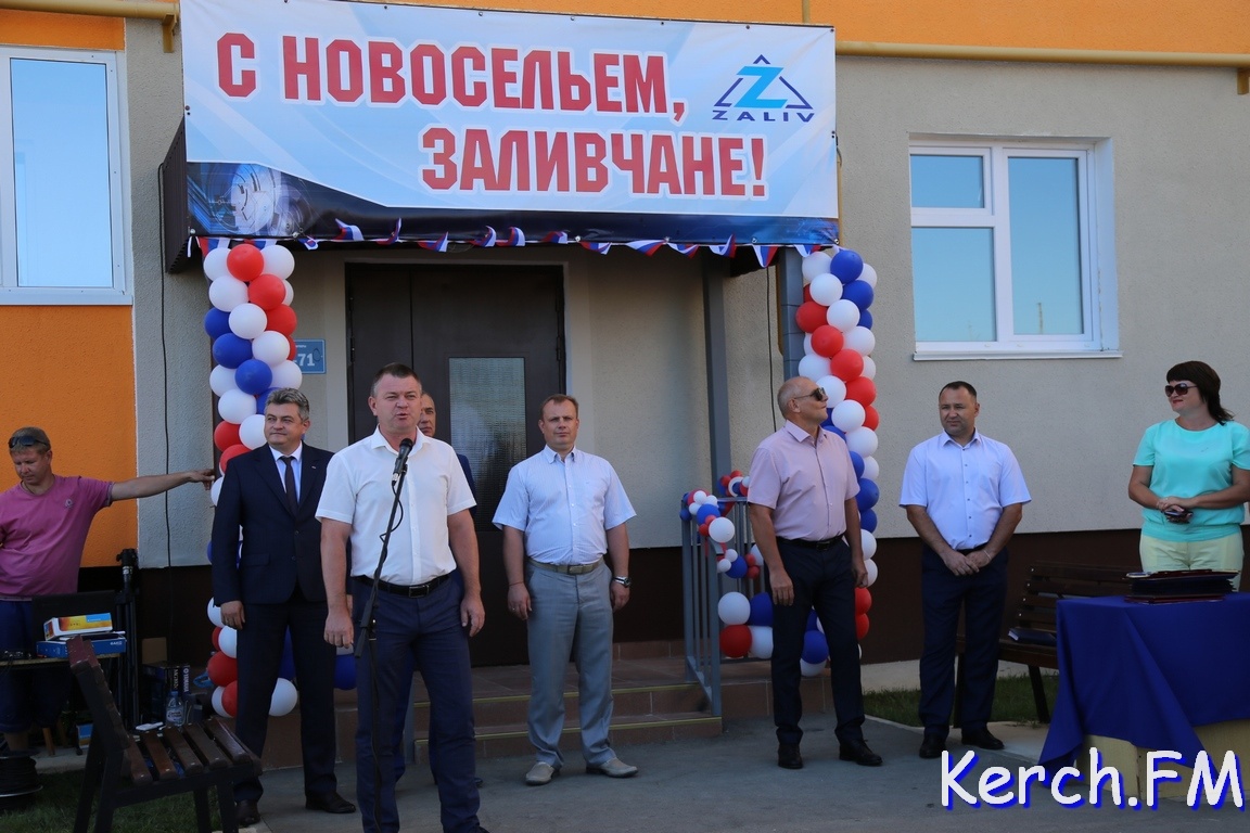 В Керчи продолжается церемония открытия нового дома для работников «Залива» на "Семи ветрах". После торжественной части у входа в дом, руководство города, министр и замдиректора завода пришли в гости к одной из семей. На новоселье власти подарили семье из Перми телевизор, пылесос и игрушки, - передает журналист Керчь.ФМ