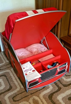Поднимается спереди. Внутри ящички, отдел для игрушек.