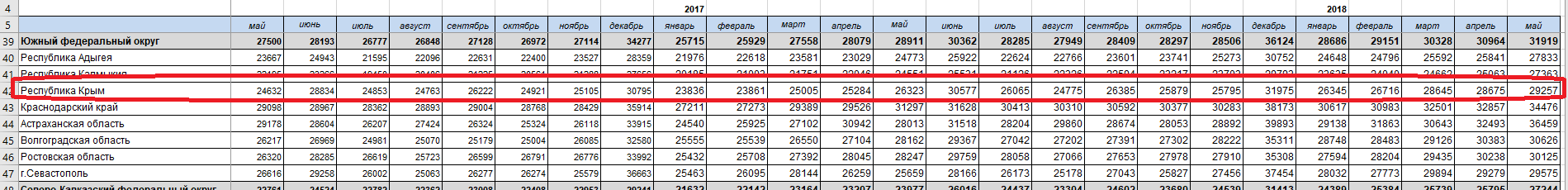 Федеральная служба государственной статистики в июле 2018 года опубликовала данные о размере заработной платы в целом по России и конкретно по регионам. Судя по таблице, средняя заработная плата в Крыму в мае составила 29 тыс 257 руб, - передает Керчь.ФМ.