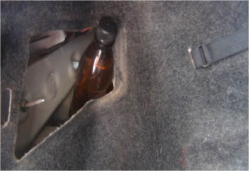 В ходе осмотра иномарки с применением специальных технических средств в багажном отделении под обшивкой и в нише для запасного колеса обнаружены емкости, предположительно содержащие алкогольную продукцию. Всего из технологических полостей извлечено более десятка пластиковых бутылей различного объема, вмещающих 14 литров спиртосодержащих жидкостей.