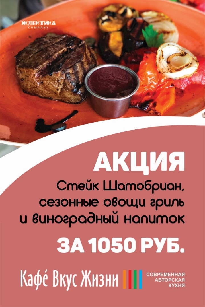 Нежное мясо Вашей любимой прожарки (хоть мы и настаиваем на Medium Rare) придется по душе как мужчинам, так и представительницам прекрасной половины! При заказе блюда действует акция. Стейк Шатобриан, сезонные овощи гриль в качестве гарнира и виноградный напиток по специальной цене. За ВСЕ 1050 руб.*