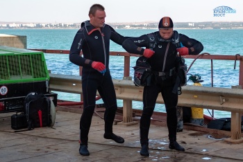 Демонтаж временных объектов в акватории выполняется совместно с водолазами. На протяжении трассы моста длиной 19 км работает несколько водолазных станций. Их сотрудники обследуют дно и поднимают на поверхность все металлические предметы. Сваи рабочих площадок, погруженные на разную глубину, извлекаются целиком или срезаются ниже линии размыва морского дна.