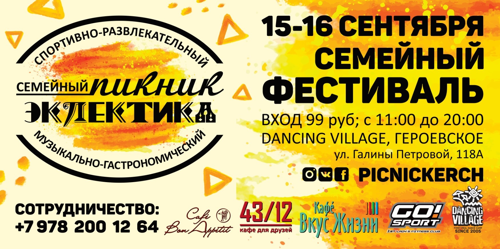 Друзья! Последние дни лета - не повод для грусти! В Крыму наступает пора бархатного сезона. Именно в этот прекрасный период компания "Эклектика" решила организовать для Вас и Ваших близких свое первое масштабное мероприятие - "Семейный пикник Эклектика", двухдневный фестиваль для детей и взрослых с насыщенной развлекательной программой на берегу Чёрного моря. Музыка, гастрономия, спорт и развлечения (https://vk.com/picnickerch - информационный ресурс фестиваля)!