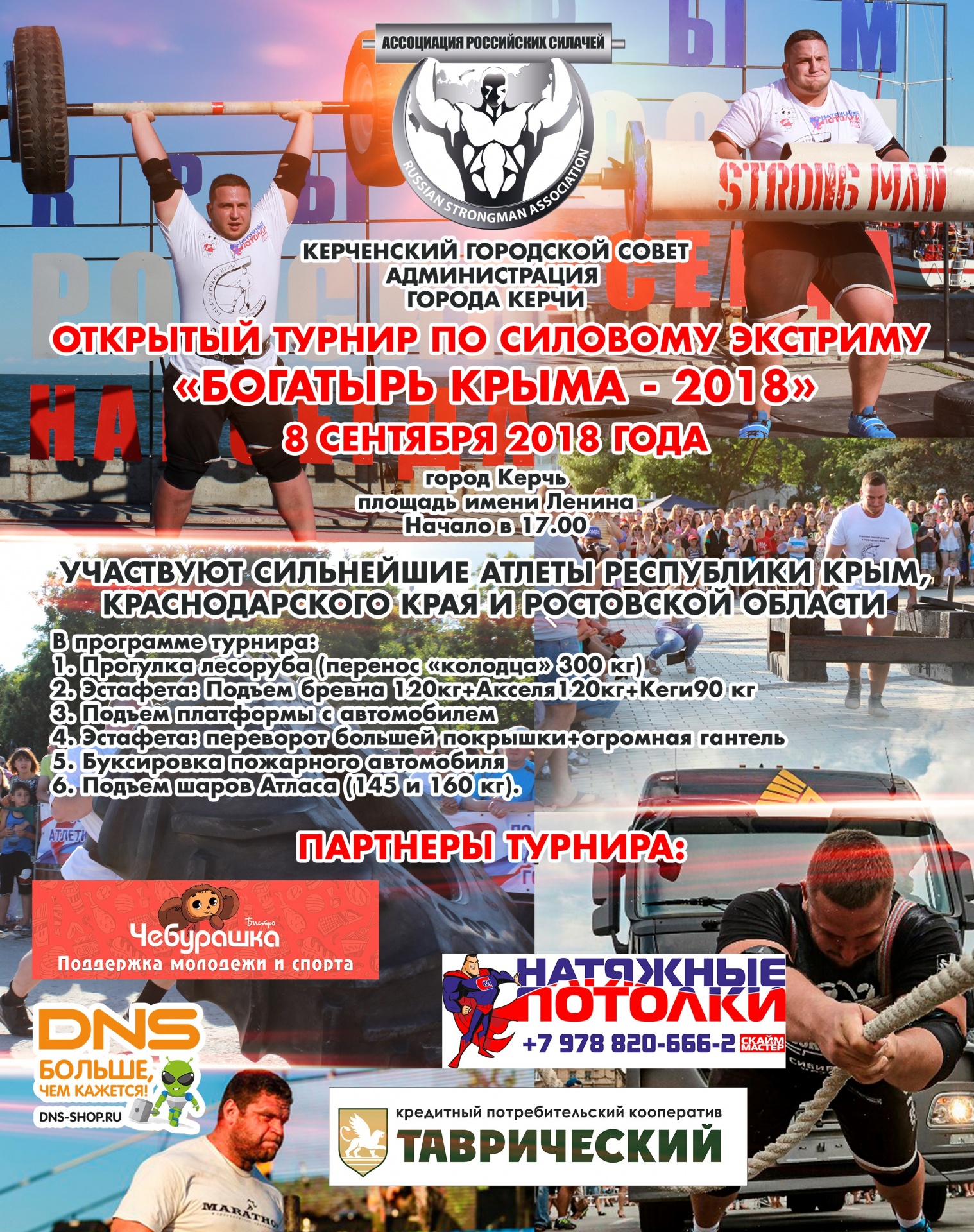 В Керчи 8 сентября в 17.00 на площади Ленина состоится Открытый турнир по силовому экстриму «Богатырь Крыма - 2018». Об этом Керчь.ФМ сообщили организаторы мероприятия, - передает Керчь.ФМ