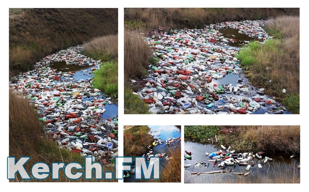В редакцию Керчь.ФМ постоянная читательница прислала фотографию и сообщила, что в районе Курортного, по пути на мыс Тархан (на востоке от мыса Зюк), находится «река мусора из бутылок».
