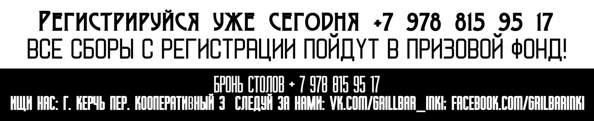 Регистрируйся уже сегодня +7 978 815 95 17, ведь мест не так много, все сборы с регистрации пойдут в призовой фонд!