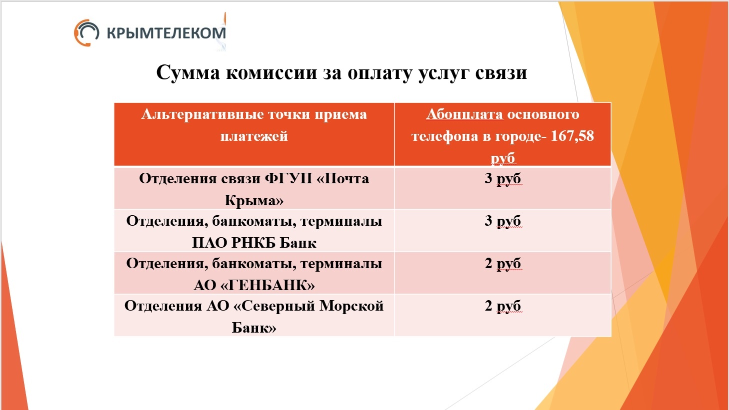 Оплачивать услуги связи можно по адресу: Керчь, ул. Кирова, 1, а также в альтернативных пунктах приема платежей.