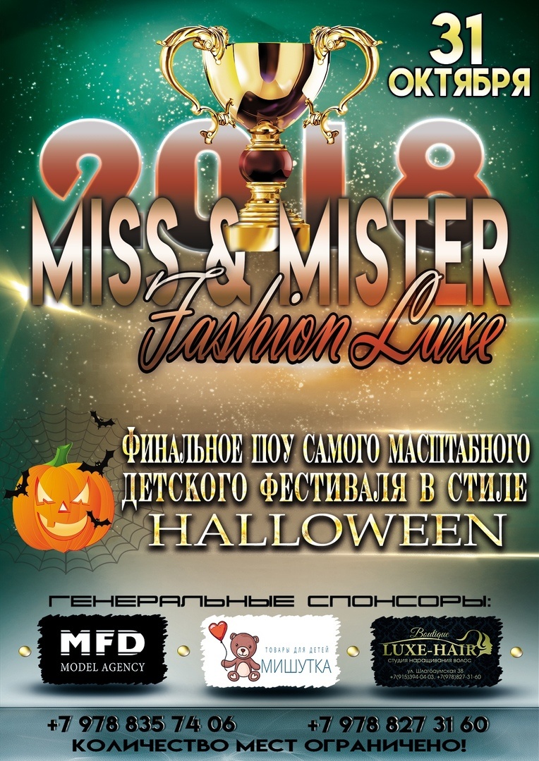 Итак : MegaPhotoDay, магазин Мишутка и студия красоты Luxe-Hair запускает грандиозный детский фестиваль красоты Miss and Mister Fashion Luxe 2018. Ваших детей ждут крутые фотосессии, увлекательные квесты, интересные экскурсии и флешмобы, занимательные конкурсы и многое другое, а так же мы устроим для них настоящий праздник и фееричное шоу в конце фестиваля. Их ждёт праздник Хеллоуин со сладостями, аниматорами, салютом и представлениями.