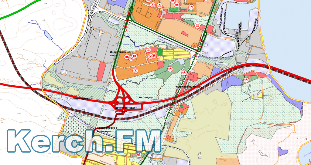 Судя по карте, в Аршинцево появится еще одна дорога и, кроме того, из города можно будет попасть на Крымский мост, не заезжая на трассу. Так, в районе нового автовокзала на автоподходах к Крымскому мосту в Керчи планируется автомобильная двухуровневая развязка. Судя по карте, на нее можно будет заехать и с Индустриального шоссе, (на карте она значится как автомобильная дорога регионального значения), и с Аршинцево. Развязка предполагает выезд на дорогу, которая идет в Аршинцево, и выезд на автоподход к Крымскому мосту.