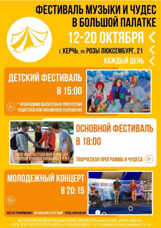 В Керчи с 12 по 20 октября пройдет фестиваль музыки и чудес в большой палатке. Организаторы - местная религиозная организация церковь христиан Веры Евангельской «Ковчег спасения», - передает Керчь.ФМ