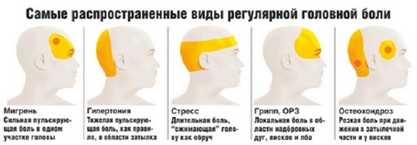 В зависимости от вида, болевые ощущения свидетельствуют о различных проблемах в организме. Боли могут проявляться в разных областях головы: в висках, в затылке, в области лба, могут быть: пульсирующей, резкой, длительной.