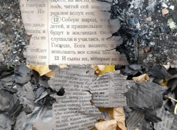 Соседка передала журналистам фотографии остатков этого костра во дворе. На обрывках горелой бумаги отчетливо видны слова «Бог», «сыны», «душа», а также номера отдельных стихов из писания. Исходя из этого, соседи сделали вывод о том, что это была религиозная печатная литература.