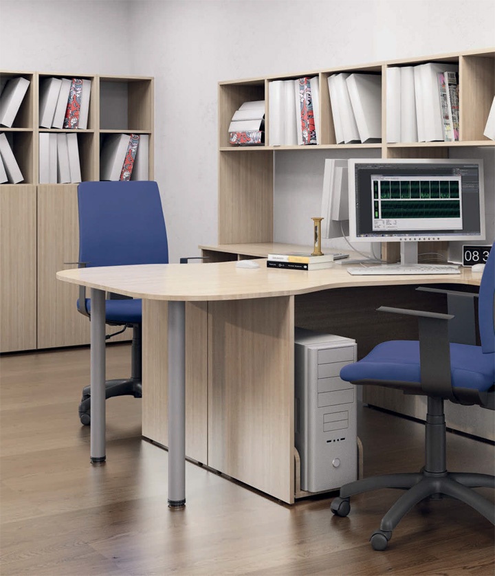 Сдвоенные рабочие места облегчают обмен информацией между сотрудниками и экономят пространство в офисе. Приставные столы удобны для посетителей. Персональные надстройки позволяют разместить текущую документацию на расстоянии вытянутой руки. А вместительные шкафы обеспечивают удобное хранение папок.
