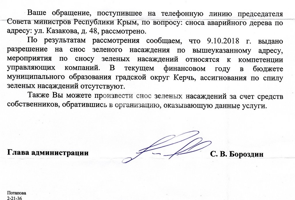 Керчанам ответили: «по результатам рассмотрения сообщаем, что 9 октября выдано разрешение на снос зеленого насаждения по указанному адресу управляющим компаниям. В текущем финансовом году в бюджете муниципального образования Керчи, ассигнования по спилу зеленых насаждений отсутствуют».