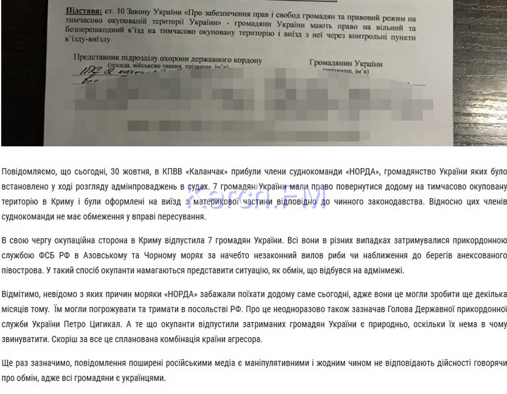 Пограничники сообщили, что сегодня, 30 октября, на КПП "Каланчак" (со стороны Украины, "Армянск", - со стороны Крыма, соответственно) прибыли члены экипажа "Норда". Ранее, украинскими судами при рассмотрении дел об админправонарушении были установлены принадлежности последних к гражданству Украины. Таким образом, все 7 членов экипажа, по утверждению ГПСУ, были оформлены на выезд в соответствии с действующим законодательством Украины. В подтверждение, ведомство опубликовало фотографию Справки с удаленными персональными данными, на которой видно, что сегодня гражданин Украины, проживающий в городе Керчь пересек границу.