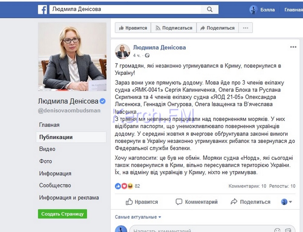 "Хочу сделать акцент? это был не обмен. Моряки судна "Норд", которые сегодня также вернулись в Крым, свободно передвигались по территории Украины. Их, в отличие от украинцев в Крыму, никто не удерживал", - утверждает Денисова.
