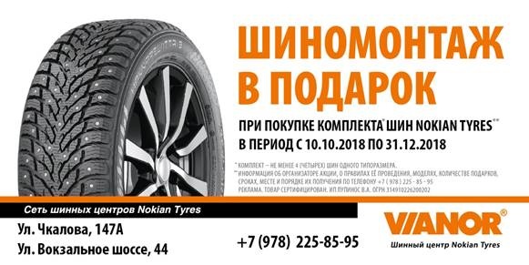 Шинный центр «VIANOR» по адресу: г. Керчь, ул. Вокзальное шоссе, 44 и ул. Чкалова, 147А приглашают Вас на бесплатный шиномонтаж при покупке комплекта шин Nokian!