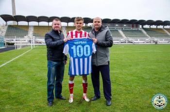 Бороздин также вручил нагрудный знак нападающему ФК «Океан» Артему Щербаку - он сыграл 100 матчей в составе футбольного клуба «Океан».