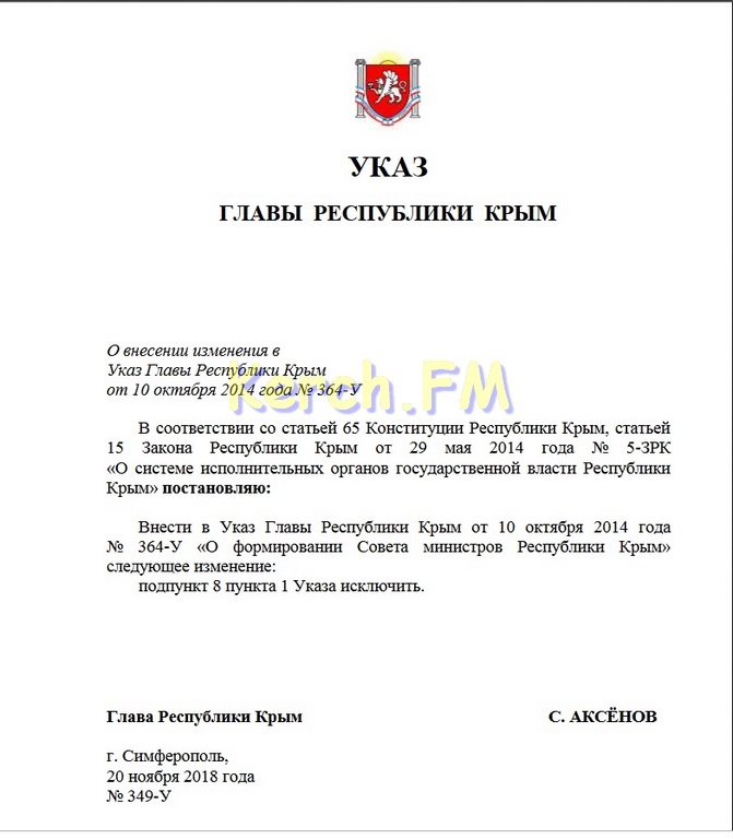 Подпункт 8 пункта 1 Указа от 10 октября 2014 года вводил в состав Совета министров Крыма должность министра финансов.