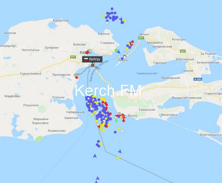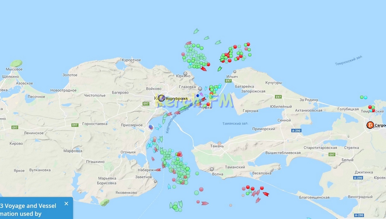 По данным информационной системы онлайн слежения за судами наблюдается большое количество ожидающих судов по обеим сторонам Керченского пролива.