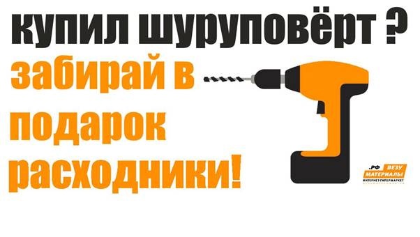 К любому шуруповёрту, который вы купите в строймаркете “Везуматериалы.рф” до 20 декабря - дарим биту (2*25), сверло по металлу (3 мм) и коробку саморезов (16 мм).