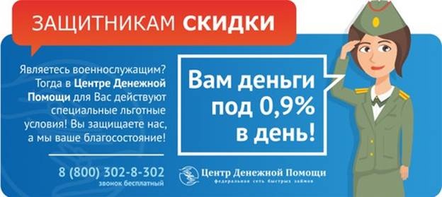 Если Вы военнослужащий, то необходимо взять с собой военное удостоверение, при предъявлении которого, для вас будут действовать льготные условия в офисах компании Центр Денежной Помощи!