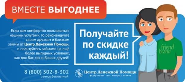 Рекомендуйте своим друзьям и близким займы от Центр Денежной Помощи, и пользуйтесь нашими услугами на ещё более выгодных условиях, как для Вас, так и Ваших друзей!