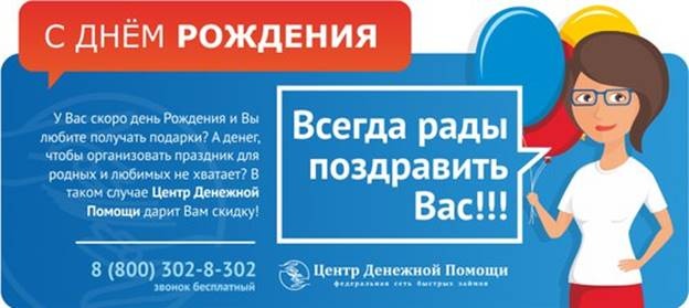 У Вас скоро день Рождения и Вы любите получать подарки?! А денег, чтобы организовать праздник для родных и любимых не хватает. В таком случае Центр Денежной Помощи дарит Вам скидку