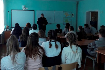 Полицейский вместе со старшеклассниками рассмотрели методы агитации молодежи в свои ряды представителями запрещенных организаций, а также формы противодействия данной противоправной деятельности.