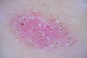 Бляшка, имеющая чёткие края красноватого цвета с неровной поверхностью, может оказаться плоскоклеточным раком. В центре образования со временем появляется вдавление, которое сначала покрывается чешуйками, а позже в этом месте образуется ранка.