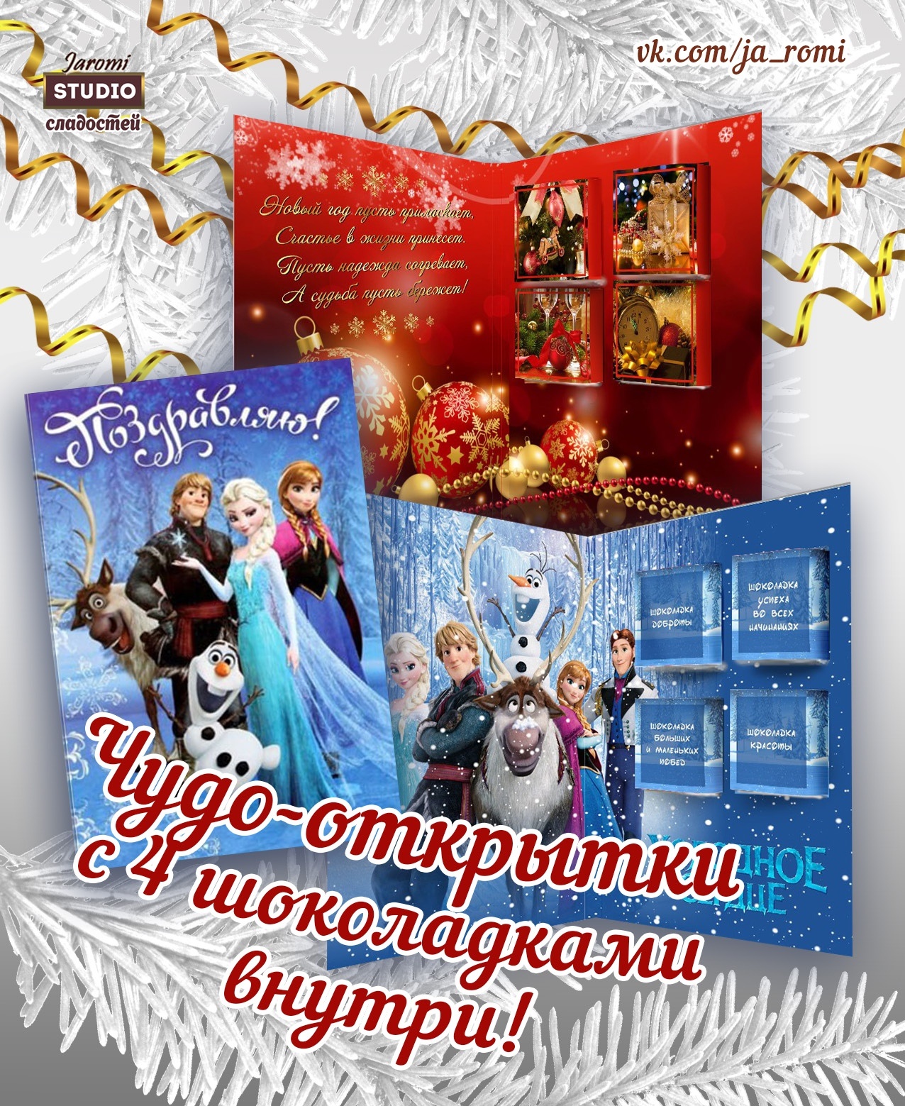 В нашем магазине "STUDIO СЛАДОСТЕЙ" появились красочные оригинальные ОТКРЫТКИ с 4 молочными ШОКОЛАДКАМИ!!!!