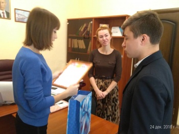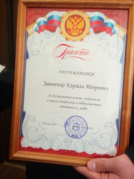 Коллектив Министерства имущественных и земельных отношений Крыма торжественно вручил на День Святого Николая обучающему 9-го класса школы-интерната Кириллу Заиченко награду от имени Главы Республики Крым как участнику пятой ежегодной премии общественного признания «Преград нет».