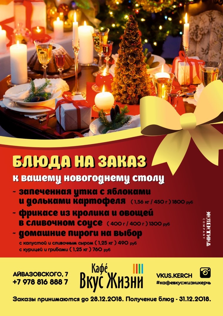 В этом году команда кафе "Вкус Жизни" спешит облегчить Ваш процесс приготовления праздничных блюд. До 28.12 (включительно) мы принимает заказы на следующие позиции: