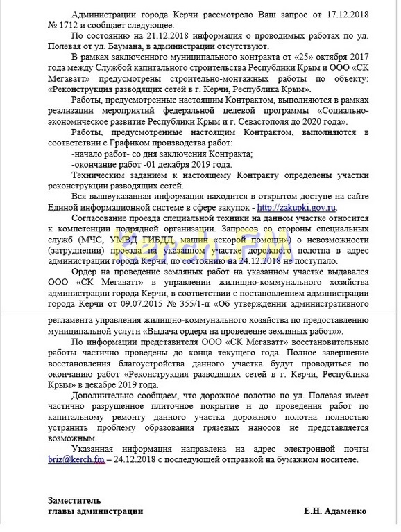 Тем не менее, совсем уйти от ответственности за состояние Полевой администрация не решилась, сообщив, что между Службой капитального строительства Республики Крым и ООО «СК Мегаватт» заключен муниципальный контракт «Реконструкция разводящих сетей в г. Керчи, Республика Крым». Окончание работ по контракту намечено на 1 декабря 2019 года.